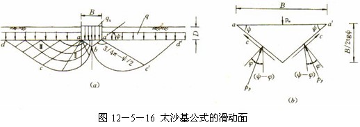 太沙基在1943年提出计算条形基础极限荷载公式·假定滑动面形状如图12-5-16所示。假定基底粗糙具有很大的摩擦力,因此AB面不会发生剪切位移,所以I区内土体不是处于朗肯主动状态,而是处于弹性压密状态,破坏时土模ABC与基底面一起移动。滑动面AC (或BC)与基底面成Φ角; II区过渡区,与普朗特尔假定相 同;III区为朗肯被动区,滑动面与水平面夹角为![]()