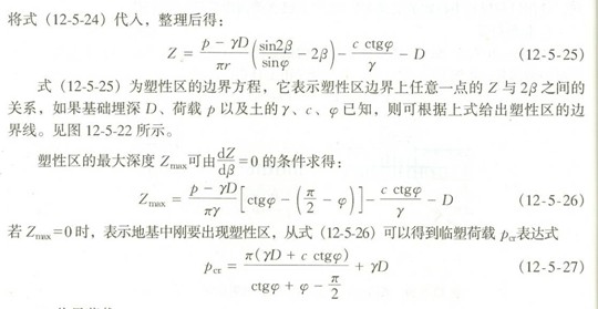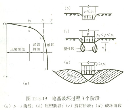 地基承载力是指地基土单位面积上所能承受荷载的能力,根据荷载试验表明随着压力的增加,地基变形相应增大。地基变形可分二个阶段,见图12-5-19 (α)的ρ-s曲线,第一阶段为oa段,地基变形主要由土体压密引起的,压力与沉降成直线关系;第二阶段相当于ab部分,沉降不再成直线关系,说明地基中有塑性区发生。当压力超过b点所对应的pj时,荷载不增加,地基沉降大量发生,说明地基中塑性区连成整片,发生整体剪切破坏。见图12-5-19 (b) (c) (d)。Pb称为比例极限或临塑荷载;Pj称为极限荷载。(由于现场荷载试验表明,不可能如理论达到整体破 坏,故在目前规范中将此值定义为特征值。)己在前面作了详细的介绍。