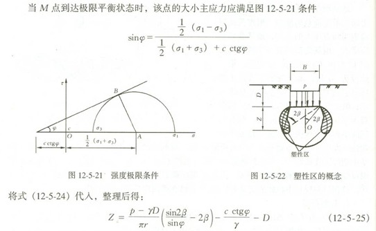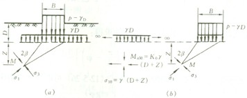 图12-5-20 (α)表示一埋置深度为D的条形基础,基底以下Z深度处M点的应力可分解成两部分,见图12-5-20 (b)。一部分是由土自重引起的应力;