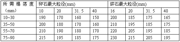 混凝土拌合物单位用水量增大,其流动性随之增大,但用水量过大,会使拌合物粘聚性和均匀性变差,产生严重泌水,分层或流浆,并有可能使混凝土强度和耐久性严重降低。混凝土拌合物的单位用水量应根据骨料品种、规格及施工要求的塌落度按表10-5-9