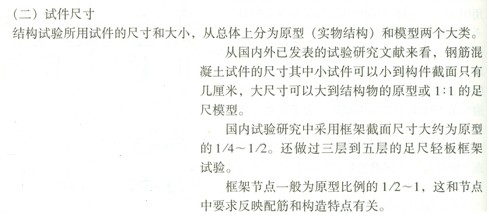一般来说,静力试验试件太小要考虑尺寸效应。在满足构造模拟要求的条件下太大的试件尺寸也没有必要。实践证明:足尺结构虽然具有反映实际构造的优点,但试验所耗费的经费和人工如用来做小比例尺试件,可以大大增加试验数量和品种,而且试验室的条件比野外现场要好,测试数据的可信度也高。因此,局部性的试件尺寸可取为原型的1/4~1,整体性的结构试验试件可取1/10—1 / 2。