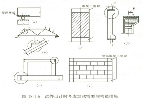 在试件设计中还必须同时考虑试件安装、加载、量测的需要,在试件上作出必要的构造措施,这对于科研试验尤为重要。例如混凝土试件的支承点应顶埋钢垫板(图18—1—6(a));在屋架试验受集中荷载作用的位置上应埋设钢板,以防止试件受局部承压而破坏;试件加载面倾斜时,应作出凸缘(图18—1—6(b)),以保证加载设备的稳定设置;在钢筋混凝土框架试验时,为了框架端部侧面施加反复荷载的需要,应设置预埋构件以便与加载用的液压加载器或测力传感器连接,为保证框架柱脚部分与试验台的固接,一般均设置加大截面的基础梁(图18—1—6(c));在砖石或砌块的砌体试验中,为了使施加在试件的垂直荷载能均匀传递,一般在砌体试件的上下均应预先浇捣混凝土的垫块(图l8—1-6((d)),对于墙体试件在墙体上下均应捣制钢筋混凝土垫梁,其中下面的垫梁可以模拟基础粱,使之与试验台座固定,上面的垫梁模拟过梁传递竖向荷载(图18—1—6(e));在作钢筋混凝土偏心受压构件试验时,在试件两端作成牛腿以增大端部承压面和便于施加偏心荷载(图18—1—6(f)),并在上下端加设分布钢筋网进行加强。