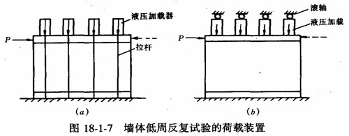 在砖石或砌块墙体的低周反复试验中,图18—1—7(a)当墙体侧向位移较大时施加竖向荷载用的拉杆对墙体的侧向位移会产生约束作用,而18—1—7(b)的加载方式就能消除约束,较好地符合实际受力情况。
