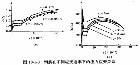 钢筋的强度随加载速度的提高面加大。见图18—1—8 (a),图中的数字ε为应变速率;和ts为达到屈服的时间,反应了加载速度。