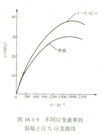 混凝土尽管是非金属材料,但也和钢筋一样,随着加载速度的增加而提高其强度和弹性模量。特别在很高应变速率的情况下,由于混凝土内部细微裂缝来不及发展,初始弹性模量随应变速率加快而提高。图18—1—9表示了应变速率对混凝土应力—应变曲线的影响。