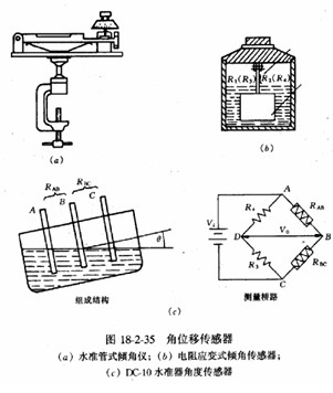 常用的角位移传感器有水准管式倾角仪、电阻应变式倾角传感器及DC—10水准式角度传感器,见图18—2—35。它们的工作原理是以重力作用线为参考,以感受元件相对于重力线的某一状态为初值,当传感器随结构一起发生角位移后,其感受元件相对于重力线的状态也随之改变,把这个相应的变化量用各种方法转换成表盘读数或各种电量。如水准管式倾角仪,用一长水准管作为感受元件,与微调螺丝和度盘配合,测量角位移;电阻应变式倾角传感器用梁式摆作为感受元件,由于摆的重力,摆上的梁将发生与角位移相应的弯曲变形,再用梁上的应变计把这个弯曲变形转换成应变输出;BC—10水准式角度传感器用液体摆来感受角位移,液面的倾斜将引起电极A、B之间和B、C之间的电阻发生相应改变,把电极A、B和C接入测量电桥,就可以得到与角位移相对应电压输出。