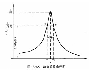 在共振曲线图的纵坐标上取 值,即0.707μ(θ)处作一水平线,使之与共振曲线相交于A、B两点,对应于A、B两点在横坐标上得ωl,ω2,即可求得衰减系数和阻尼比: