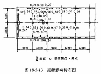 在工业厂房中经常要求测量某种振源(如锻锤、水爆清砂,空气压缩机等)引起的振动在建筑物内地面和楼层传布和衰减的情况。可如图18—5—13在各测点量测振幅,以振源处实测振幅为1,与之相比求得各点的衰减系数。此外,还可通过在地面和楼层不同测点的振动记录曲线求得振动在土壤和楼层中传播的速度。