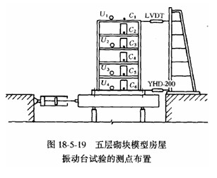 地震模拟振动台试验的结构反应量测中最基本的是量测结构或构件的位移和加速度反应,一般均将测点布置在产生最大位移或加速度的部位,对于整体结构的房屋模型试验,则在每一层楼面和顶层高度的位置上,布置位移和加速度传感器(要求传感器的频响范围为0—100Hz)如图18—5—19对于结构构件的主要受力部位和截面上,要求测量钢筋和混凝土的应变,来自位移、加速度和应变传感器的所有信号被连续输入磁带记录仪,或是由专用的数据采集系统进行数据采集和处理,其结果可由计算机终端显示或用绘图机、硬拷贝等设备描绘打印输出。