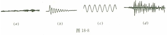 7.图18-8所示实测振动波形图中,哪一个是地震模拟振动台试验时试件的加速度 反应时程曲线?(D)