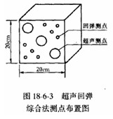 采用超声回弹综合法检测混凝土强度时,超声的测点应布置在同一个测区的回弹值的测试面上,测量声速的探头的安装位置不宜与回弹仪的弹击点相重叠。测点布置如图18—6—3所示,结构或构件的每一测区内,宜先进行回弹测试,后进行超声测试,同时要注意,只有同一个测区内所测得的回弹值和声速值才能作为推算混凝土强度的综合参数,不同测区的测量值不得混用。