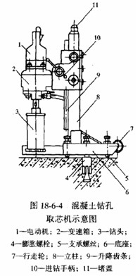 钻芯法试验是使用专用的取芯钻机(图18—6—4),从被检测的结构或构件上直接钻取圆柱形的混凝土芯样,并根据芯样的抗压试验由抗压强度推定混凝土的立方抗压强度。它不需要建立混凝土的某种物理量与强度之间的换算关系,被认为是一种较为直观可靠的检测混凝土强度的方法。由于需要从结构构件上取样,对原结构有局部损伤,所以是一种能反映被试结构混凝土实际状态的现场检测的半破损试验方法。