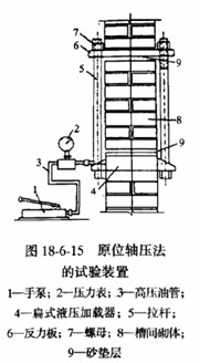 原位轴压法的试验装置由扁式液压加载器、反力平衡架和液压加载系统组成(图18—6—15),测试时先在砌体测试部位垂直方向按试件高度上下两端各开凿一个水平槽,将反力平衡架的反力板置于上槽孔,在下槽孔内嵌入—扁式加载器,并用白平衡拉杆固定。