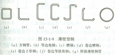 薄壁型钢的壁厚一般为1.5--5mm,但承重结构受力构件的壁厚不宜小于2mm。常用 薄壁型钢的截面形式图15-1-9。