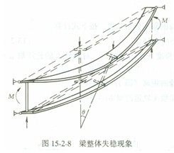 有些梁在外荷载作用下,虽然截面强度都满足要求,但是仍然会发生侧向弯曲和扭转 (图15-2-8)。这就是梁的整体失稳。