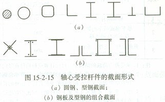 轴心受拉构件可采用圆钢、钢管、角钢、工字钢或宽翼缘工字钢(H型钢)、槽钢等(图15-2-15a)以及用钢板或型钢组合而成的截面形式(图15-2-15b)。作用力通过截面形心,并与杆件轴线重合。