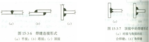 连接形式(图15-3-6):平接、塔接、顶接。顶接中焊缝形式有对接与角接的组合焊缝和角焊缝(图15-3-7)。