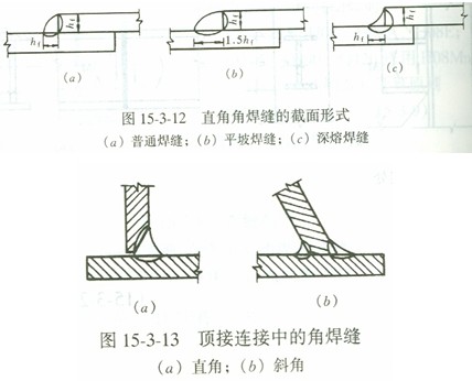 直角角焊缝见图15-3-12和图15-2-13(a),斜角角焊缝见图15-2-13(b)。