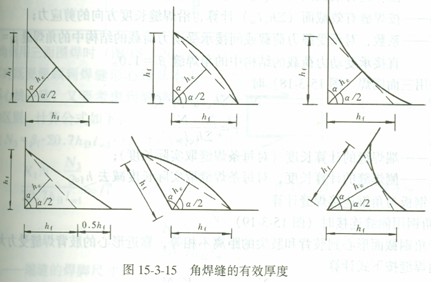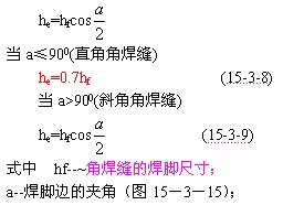 不论端缝或侧缝,角焊缝破坏面假定沿焊脚a/2面破坏(图15-3-15)。破坏面上厚度称为有效厚度he,其值为: