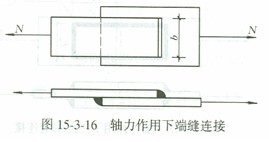 轴力N通过焊缝形心,焊缝应力均匀分布,当力垂直于焊缝方向(端缝)时(图15-3-16)。