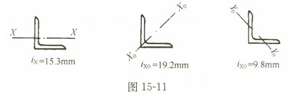 5.某三角形钢屋架的受拉斜腹杆为L 50X5的等边单角钢,通过角钢肢宽的两侧角 焊缝焊在屋架的上、下弦节点板上。钢材为Q235-B·F,腹杆在屋架节点之间的几何长度为2.1m, L 50X5角钢的截面积为480mm2,截面回转半径如图15-11所示。斜腹杆的 抗拉承载力设计值和长细比为: (C)