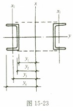 11.计算图15-23双肢格构式压弯构件绕虚轴(x轴)整体稳定时,截面抵抗矩W1x=Ix/y0,其中y0应为(C) :