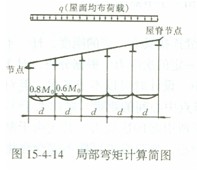 上弦局部弯矩:上弦有节间荷载时,除轴向力外,还有局部弯矩。关于局部弯矩的计算,既要考虑上弦的连续性,又要考虑上弦节点的弹性位移。为了简化,可近似地先按简支梁计算出弯矩Mo,然后再乘以调整系数。端节间的正弯矩M1=0.8Mo,其他节间的正弯矩和节点负弯矩为M2=0.6Mo。(图15-4-14)