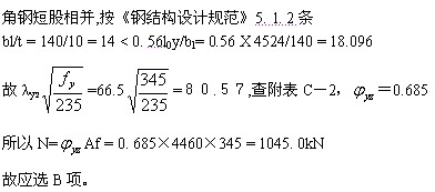例:某屋架钢材为Q345,上弦杆计算长度lox=1508mm, loy=4524mm,上弦杆截面2∠140 X 90 X 10(短肢相并), A = 4460mm2, Ix = 292×104mm4, Iy = 2063X104mm4,[λ]=150,则上弦杆承载力设计值为( ) kN。