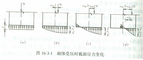 砌体结构构件中,轴心及偏心受压构件是最基本的构件。在轴心荷载作用下,砌体截 面中应力为均匀分布(图16-3-1a)。随着荷载偏心距的增大,受力特性将发生很大变化。当偏心距不大时,整个截面受压,由于砌体的弹塑性性能,截面中的应力呈曲线分布(图16-3-1b)。当偏心距加大,远离荷载的截面边缘,由受压逐渐过渡到受拉。当受拉边缘的应力大于砌体沿通缝截面的弯曲抗拉强度时,砌体受拉区将出现沿截面通缝的水平裂缝(图16-3-1c),随着裂缝的开展,受压区面积减小。对出现裂缝后的剩余截面,纵向力的偏心距将减小(图16-3-1d),故裂缝不至于无限制地发展,以致使构件破坏,而是在剩余截面和减小偏心距作用下达到新的平衡,这时压应力仍可增大,随着荷载的不断增加,裂缝不断开展,旧平衡不断破坏而达到新的平衡,当剩余截面减小到一定程度时,导致砌体受压边出现竖向裂缝,最后导致构件破坏。