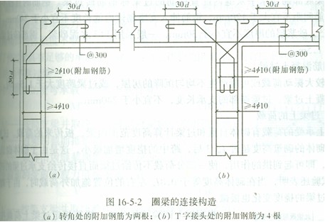 5.圈梁在房屋转角、丁字接头处的连接如图16-5-2a、b