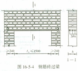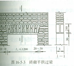 过梁可采用砖砌过梁和钢筋混凝土过梁。砖砌过梁又可分为砖砌平拱过梁(图16-5-3)和钢筋砖过梁(图16-5-4)。