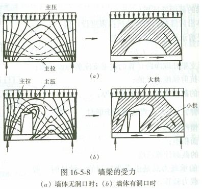 墙梁是由墙和托梁组合而成。当托梁及其上的墙体达到一定强度后。它们两者就能共同工作,在裂缝出现前,如同钢筋混凝土和砖砌体两种材料组成的深梁。根据用有限单元法分析。在均布荷载作用下,其主应力轨迹线如图16-5-8所示。当墙体无洞口时,主压应力都指向支座,墙梁形成拱作用,托梁主要受拉,这与一般受弯构件情况不同。根据试验研究,影响墙梁破坏形态的因素较多,如砌体高跨比(hw/l0)、托梁高跨比(hh/l0)、砌体的抗压强度设计值(f)、混凝土的轴心抗压强度设计值(fc)、托梁的纵向受力钢筋配筋率(ρ)、加荷方式、墙体开洞情况以及有无纵向翼墙等。由于这些因素的不同,将发生下述几种破坏形态。(图16-5-9)