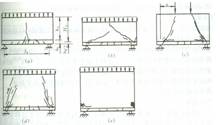 当hw/lo >0.35~0.4,或集中荷载作用剪跨比(hw/lo)较小时,支座附近的砌体中主压应力,超过抗压强度而产生沿斜向的斜压破坏。这种破坏裂缝较多且穿过砖和灰缝,裂缝倾角一般在550~600以上,破坏时有被压碎的砌体碎屑,其极限承载力较大。