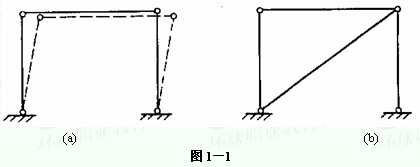 其中n为体系中的刚片总数,H、R分别为体系中的单铰总数和支杆总数。例如图1-1所示体系的自由度分别为1和0。自由度大于零的体系一定是几何可变的。自由度等于零及小于零的体系,可能是几何不变的也可能是几何可变的,要根据体系中的约束布置情况确定。