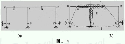 [解] 体系的自由度W=3×3-2×2-5=0。根据两元片规则,将地基延伸至固定铰A、C处,并将地基作为刚片I,将杆件BEFG作为刚片Ⅱ(图1-4(b)),刚片I和Ⅱ由支座链杆B、等效链杆AE、CG相连接,这三根链杆不相交于一点,体系是几何不变的,且无多余约束。