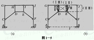 [解] 体系的自由度W=3×10—2×12—6=0。将地基并连同杆件ACG、BFJ作为刚片I、杆件DH、EI作为刚片Ⅱ、Ⅲ(图1-5(b)),则刚片I、Ⅱ、Ⅲ由三个虚铰(IⅡ)、(IⅢ)、(ⅡⅢ)两两相连,其中虚铰(ⅡⅢ)由一组平行链杆形成,而虚铰(IⅡ)、(IⅢ)的连接线平行于形成虚铰(ⅡⅢ)的两根平行链杆,可视为三虚铰在同一直线上,体系为瞬变体系。