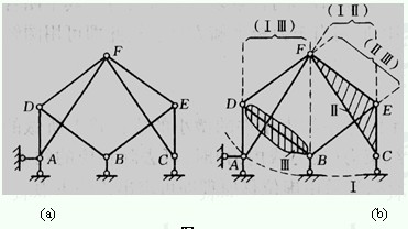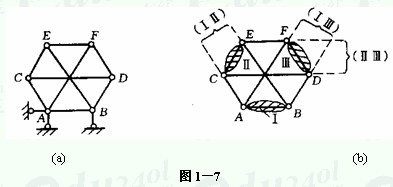 [例1-4] 分析图1-7(a)所示体系的几何组成。