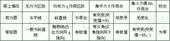 在直杆中,根据荷载集度q,弯矩M、剪力V之间的微分关系dV/dx=q,dM/dx=V、d2M/dx2=q,可推出荷载与内力图的一些对应关系,这些对应关系构成了弯矩图与剪力图的形状特征(表2—1)。