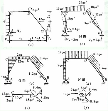 BE杆:MBD=0,MDB=18qa2(右侧受拉);VBD=—1.2qa,VDB=8.4qa;NBD=—1.6qa,NDB=—8.8qa。