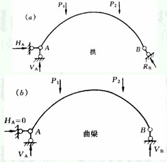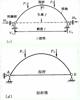 三铰拱的有关术语表示在图2—6(c)中,工程中常用的矢跨比f/l=0.5~1,常用的拱轴方程有二次抛物线,圆弧线,悬链曲线等。