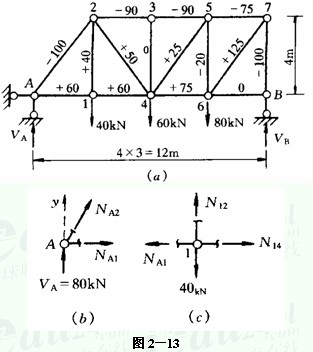 依次再考虑节点2、3、4、5、6、7,每—结点不超过两个未知力。至最后节点B时,各杆轴力均为已知,可据此节点是否满足平衡条件作为内力计算的校核。各杆轴力计算的结果标注在图2—13a上,拉力为正,压力为负。