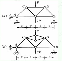 如图2—20a中的CD杆变换成图2—20b中的小桁架CD,而作用的荷载及端部C、D的约束性质不变,则在作这种构造的局部改变后,只对CD部分的内力发生变化,其余部分的反力和内力均保持不变。