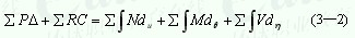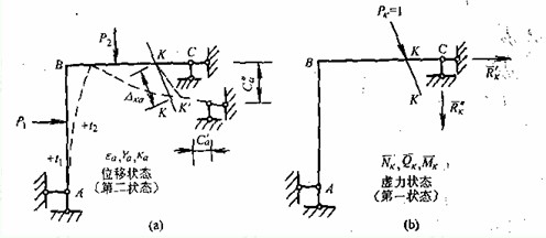上式也称为变形体系的虚功方程。式中P为作虚功的广义力,Δ为与P相应的广义 位移;C是支座的线位移或角位移,R是与C相应的作虚功的支座反力或反力矩;M、N、V分别表示作虚功的平衡力系中微段上的弯矩、轴向力、剪力;dθ、du、dη分别表示虚位移状态中同一微段的弯曲变形、轴向变形、平均剪切变形。