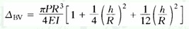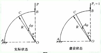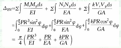 上式等号右边括号内的第一、第二、第三项分别为弯曲变形、轴向变形、剪切变形对 位移的影响。可见,当h/R较小时,轴向变形、剪切变形对位移的影响相对于弯曲变形对位移的影响甚小,通常可忽略不计。所得结果为正,表示B点竖向位移的实际方向与Pi=1的指向相同。