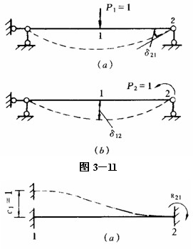 上式表示同一线性弹性体系由单位荷载P1=1所引起的与荷载P2相应的位移δ21 等于由单位荷载P2=1所引起的与荷载P1相应的位移δ12。这里的荷载可以是广义荷载,因而位移可以是相应的广义位移。如图3—11a、b中的δ12=δ21。