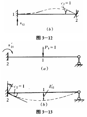 上式表示同一线性弹性体系由单位位移cl=1所引起的与位移c2相应的反力R21等于由单位位移c2=1所引起的与位移cl相应的反力R12。如图3—12a、b中的R12=R21。