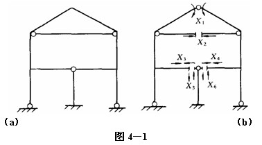 去除图4—1a所示超静定结构的多余约束的方法之一如图4—1b所示,去除六个多余约束后,就成为静定结构,故为超静定六次。再用其他去除多余约束的方案确定其超静定次数,结果是相同的。