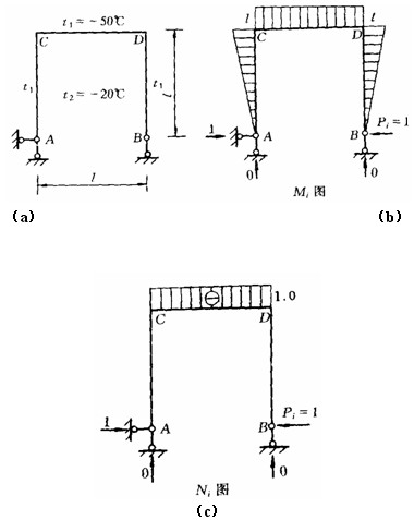 [例3—4] 图3—7所示刚架施工时的温度为300C,冬季外侧温度为—200C,内侧温度为100C,各杆截面相同,均为矩形截面,截面高度为h,材料的线膨胀系数为α。试求刚架在冬季温度时B点的水平位移ΔBH。