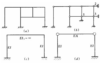 图4—7c所示刚架,其横梁不能弯曲,当不考虑各杆轴向变形时,两个刚结点不能转动,只有一个独立的结点线位移未知量。图4—7d所示结构,如果考虑柱顶轴力杆的轴向变形,而不计受弯杆柱子的轴向变形,则有两个独立的结点线位移未知量。