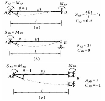 转动刚度SAB表示AB杆的A端抵抗转动的能力,其值等于A端转动单位转角时A端所需施加的力矩,力矩值的大小与B端的约束情况及杆件的弯曲刚度有关。图4—10a、b、c所示三种等截面直杆的转动刚度示于图中。